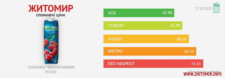 Моніторинг здійснено на основі інформації, отриманої за методом контрольної закупки 27.10.2023 р. у місцях продажу: АТБ, пр. Миру, 15 А, Ашан, вул. Київська, 77 , Метро, вул. Ватутіна, 55-в, Сільпо, пл. Житній ринок, 1, Еко Маркет, вул. М. Бердичівська, 2/7