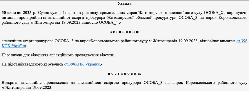 Житомирський апеляційний суд ухвалою від 30 жовтня 2023 року відкрив апеляційне провадження.