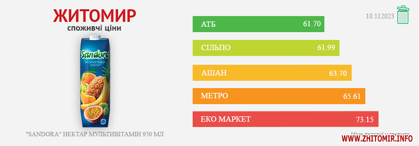 Моніторинг здійснено на основі інформації, отриманої за методом контрольної закупки 10.11.2023 р. у місцях продажу: АТБ, пр. Миру, 15 А, Ашан, вул. Київська, 77, Метро, вул. Ватутіна, 55-в, Сільпо, пл. Житній ринок, 1, Еко Маркет, вул. М. Бердичівська, 2/7