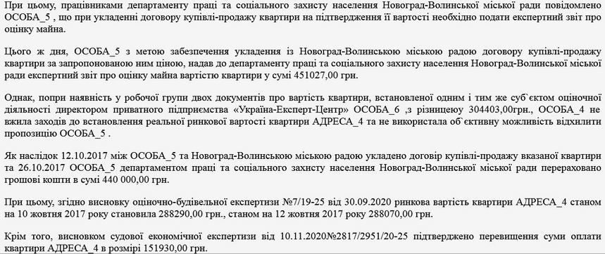 У справі про купівлю у 2017 році квартири для дитини-сироти за завищеною ціною Новоград-Волинський міськрайонний суд визнав невинними продавця і експерта, вину за вчинене поклали на тодішню заступницю директора департаменту праці та соціального захисту населення міської ради, але від покарання її звільнили.