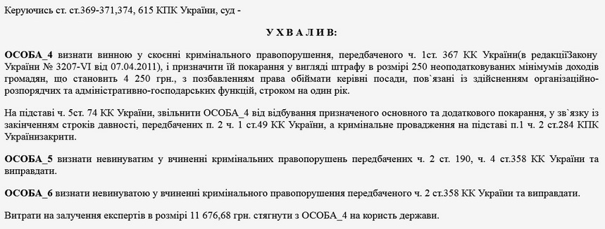 Також суд визнав невинуватою та виправдав ОСОБУ_6 – директорку житомирського ПП «Україна-Експерт-Центр».