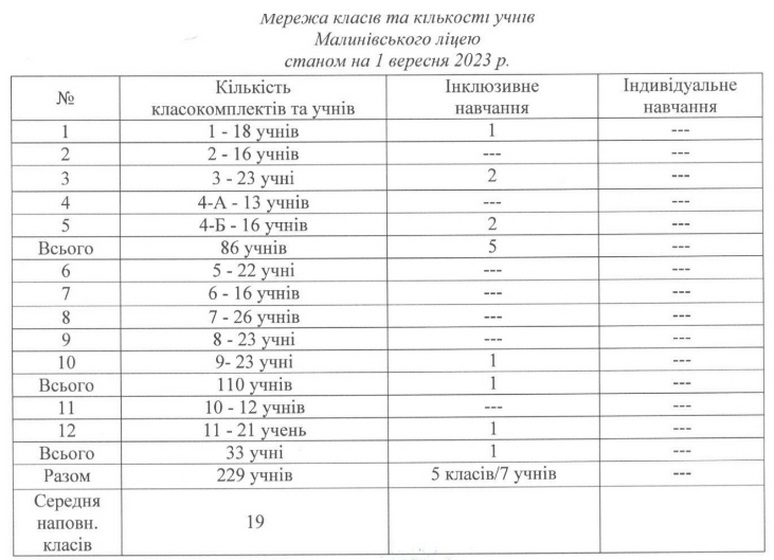 Інформація з сайту Малинівського ліцею: На 1 вересня 2023 року в ліцеї було 229 учнів, середня наповнюваність класів – 19 осіб. Для успішного навчання дітей облаштовані 18 класних кімнат, з них 2 кабінети інформатики, спортивна зала, актова зала, їдальня, майстерня трудового навчання.