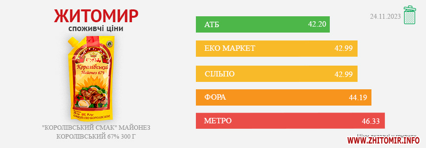 Моніторинг здійснено на основі інформації, отриманої за методом контрольної закупки 24.11.2023 р. у місцях продажу: АТБ, пр. Миру, 15 А, Фора, вул. Лятошинського, 2, Метро, вул. Ватутіна, 55-в, Сільпо, пл. Житній ринок, 1, Еко Маркет, вул. М. Бердичівська, 2/7