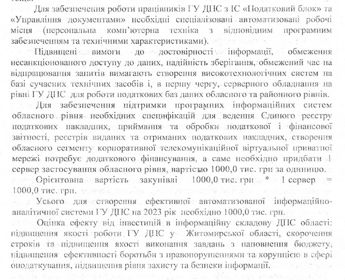 Фактично програма, яка була розроблена ГУ ДПС у Житомирській області і повинна бути реалізована в 2023 році, передбачає виділення з обласного бюджету 1 млн грн на закупівлю сервера.