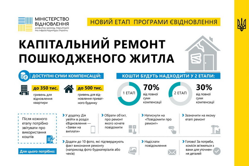 «Це черговий етап програми єВідновлення – державної грошової допомоги – максимальним розміром до 350 тисяч гривень за квартиру і 500 тисяч за приватний будинок. Гроші будуть надходити двома траншами. Спочатку 70% від погодженої суми, згодом – ще 30%», - йдеться у повідомленні.