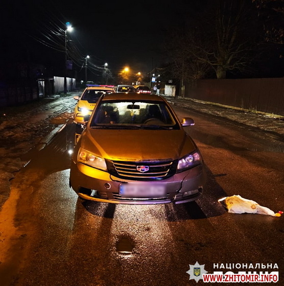Попередньо, водійка автомобіля Geely, 38-річна містянка, здійснила наїзд на жінку, яка у цей час перетинала автошлях, ведучи велосипед у руках. У результаті ДТП 80-річна бердичівлянка отримала травми та була ушпиталена до відділення інтенсивної терапії міської лікарні.