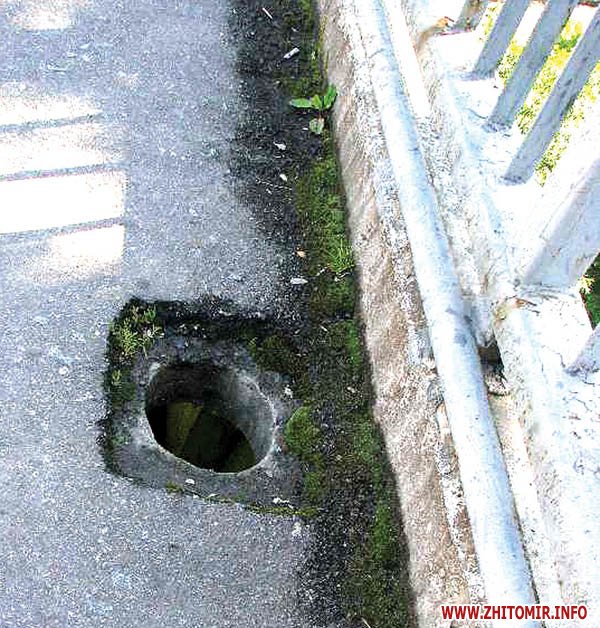 Каждый, кто хоть раз проходил по этому излюбленному месту прогулок в Житомире, обращал внимание на отсутствие здесь канализационных решеток. В общем, мост усеян сплошными дырами, в которые без труда может попасть нога человека. Тяжело не согласиться, что многих эти отверстия все-таки пугают. Но проходящие люди тешат себя тем, что провалиться здесь - нереально. И в этом они правы: провалиться-то не провалишься, а вот ноги переломать вполне реально! Тем более если учесть, что часто на мосту встречаются люди в не совсем адекватном состоянии.