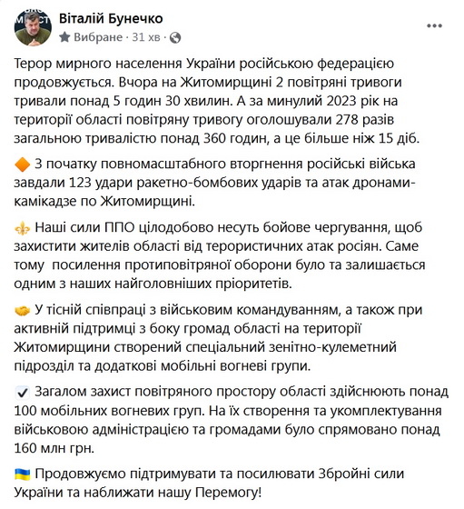 «Наші сили ППО цілодобово несуть бойове чергування, щоб захистити жителів області від терористичних атак росіян. Саме тому посилення протиповітряної оборони було та залишається одним з наших найголовніших пріоритетів. У тісній співпраці з військовим командуванням, а також при активній підтримці з боку громад області на території Житомирщини створений спеціальний зенітно-кулеметний підрозділ та додаткові мобільні вогневі групи. Загалом захист повітряного простору області здійснюють понад 100 мобільних вогневих груп (виділено ред.). На їх створення та укомплектування військовою адміністрацією та громадами було спрямовано понад 160 млн грн», - йдеться у повідомленні.
