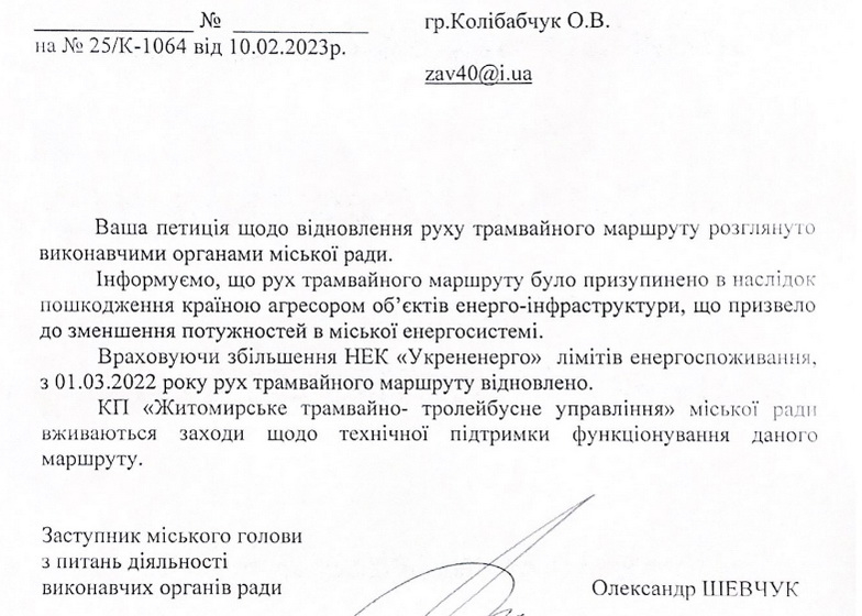 «Житомиряни дуже стурбовані чутками про можливий демонтаж трамвайної лінії і прибирання трамваїв з Житомира. Хотілося б почути від влади її бачення продовження роботи трамвайних маршрутів та перспективи розвитку трамвая в місті Житомирі», - йшлося у зверненні, яке підписали 322 особи.