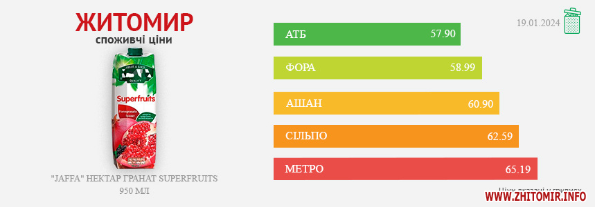 Моніторинг здійснено на основі інформації, отриманої за методом контрольної закупки 19.01.2024 р. у місцях продажу: АТБ, пр. Миру, 15 А, Фора, вул. Лятошинського, 2, Метро, вул. Ватутіна, 55-в, Сільпо, пл. Житній ринок, 1, Ашан, вул. Київська, 77