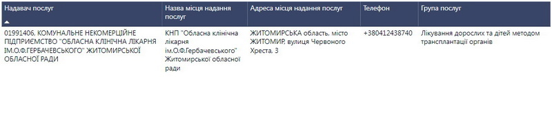 Зауважимо, що в Житомирській області послуги з трансплантації органів за цією програмою можна отримати в одному закладі - КНП «Обласна клінічна лікарня ім. О.Ф.Гербачевського» Житомирської обласної ради.