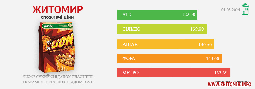 Моніторинг здійснено на основі інформації, отриманої за методом контрольної закупки 01.03.2024 р. у місцях продажу: АТБ, пр. Миру, 15 А, Фора, вул. Лятошинського, 2, Метро, вул. Ватутіна, 55-в, Сільпо, пл. Житній ринок, 1, Ашан, вул. Київська, 77
