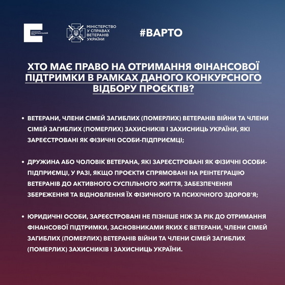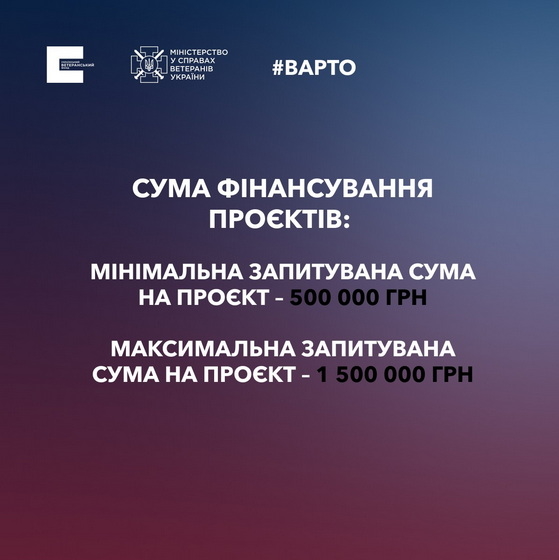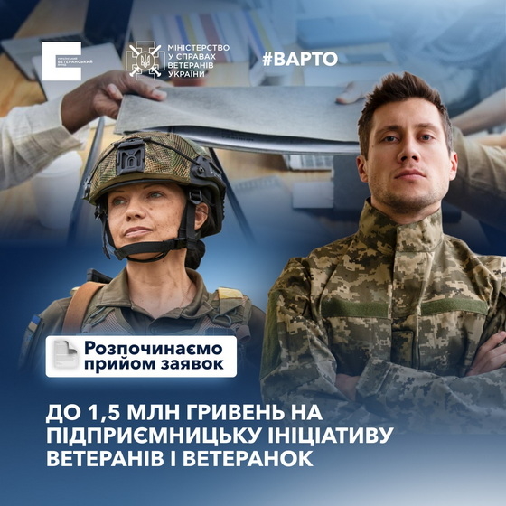 «У середу, 6 березня, Український ветеранський фонд Міністерства у справах ветеранів України розпочав прийом заявок на програму фінансування ветеранського бізнесу «Варто розпочати власну справу». За умовами конкурсу, на започаткування чи розвиток власної справи ветерани та їхні родини можуть отримати від 500 тисяч до 1,5 мільйона гривень», - йдеться у повідомленні.