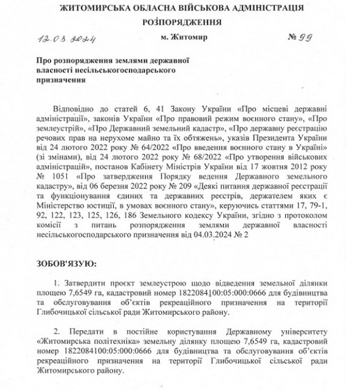 «Затвердити проєкт землеустрою щодо відведення земельної ділянки площею 7,6549 га, кадастровий номер 1822084100:05:000:0666 для будівництва та обслуговування об’єктів рекреаційного призначення на території Глибочицької сільської ради Житомирського району. Передати в постійне користування Державному університету «Житомирська політехніка» земельну ділянку площею 7,6549 га, кадастровий номер 1822084100:05:000:0666 для будівництва та обслуговування об’єктів рекреаційного призначення на території Глибочицької сільської ради Житомирського району», - йдеться у документі.
