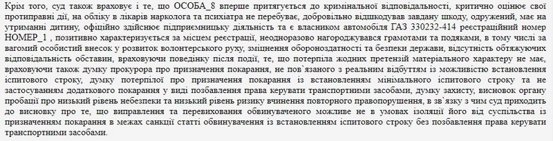 В якості пом’якшуючих обставин суд визнав також те, що обвинувачений неодноразово нагороджувався грамотами та подяками, в тому числі за вагомий особистий внесок у розвиток волонтерського руху, зміцнення обороноздатності та безпеки держави.
