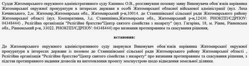 До Житомирського окружного адміністративного суду звернувся в.о. керівника Житомирської окружної прокуратури в інтересах держави із позовом до Станишівської сільської ради Житомирського району, релігійної організації «Релігійне братство «Центр святого сімейства з назарету» про визнання протиправним та скасування рішення з підстав протиправного надання дозволів на виготовлення проєкту землеустрою щодо відведення земельної ділянки.