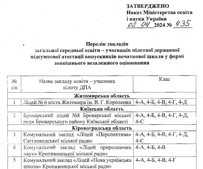 Міністерство освіти і науки затвердило затвердження переліку закладів загальної середньої освіти – учасників пілотної державної підсумкової атестації випускників початкової школи у формі зовнішнього незалежного оцінювання.