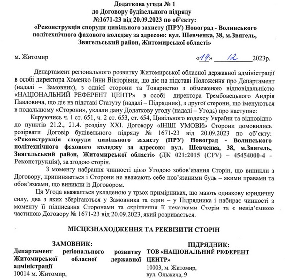Зауважимо, що минулого року департамент регіонального розвитку ОДА вже проводив закупівлю щодо укриття цього коледжу: 22 серпня 2023 року був оголошений тендер на реконструкцію споруди цивільного захисту Новоград-Волинського політехнічного фахового коледжу з очікуваною вартістю 17 млн 159 тис. 461,20 грн. Єдиним учасником і переможцем закупівлі стало ТОВ «Національний референт центр» з пропозицією 15 млн 741 тис. 808 грн, 20 вересня з фірмою підписали договір про виконання робіт до 20 грудня 2023 року, але додатковою угодою від 19 грудня договір розірвали «за згодою сторін», фірмі нічого не заплатили.