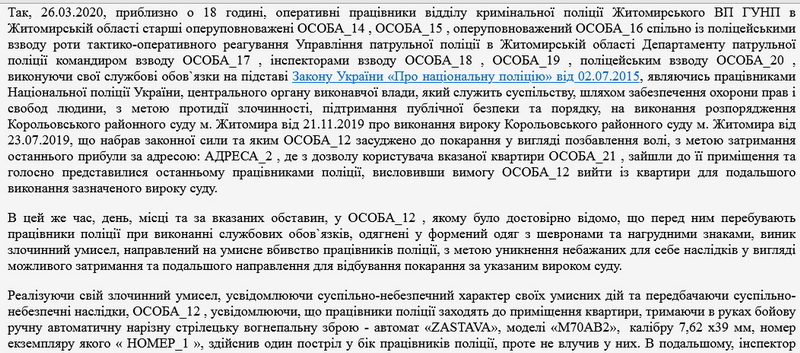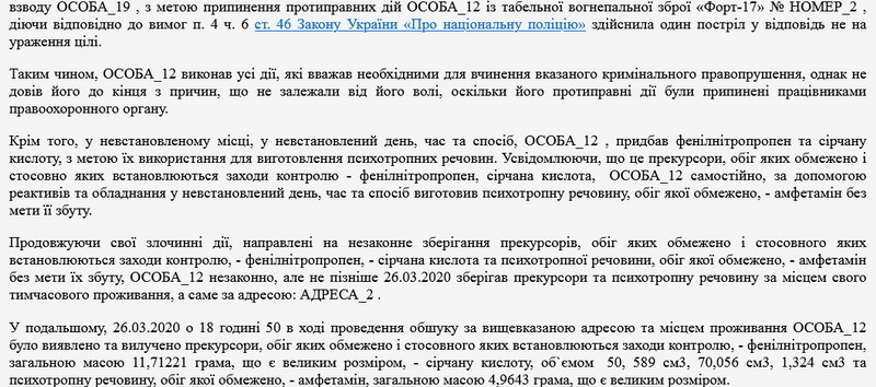 «За публічного обвинувачення Житомирської окружної прокуратури чоловіка визнано винним у незаконному придбанні і зберіганні вогнепальної зброї та бойових припасів, незаконному виготовленні й зберіганні психотропної речовини у великих розмірах без мети збуту, у повторному незаконному придбанні та зберіганні прекурсорів у великих розмірах з метою їх використання для виготовлення психотропних речовин, а також у замаху на вбивство правоохоронців, у зв'язку з виконанням ними службових обов'язків (ч. 1 ст. 263, ч. 2 ст. 309, ч. 2 ст. 311, ст. 348 КК України). Його засуджено до 10 років позбавлення волі», - йдеться в повідомленні.