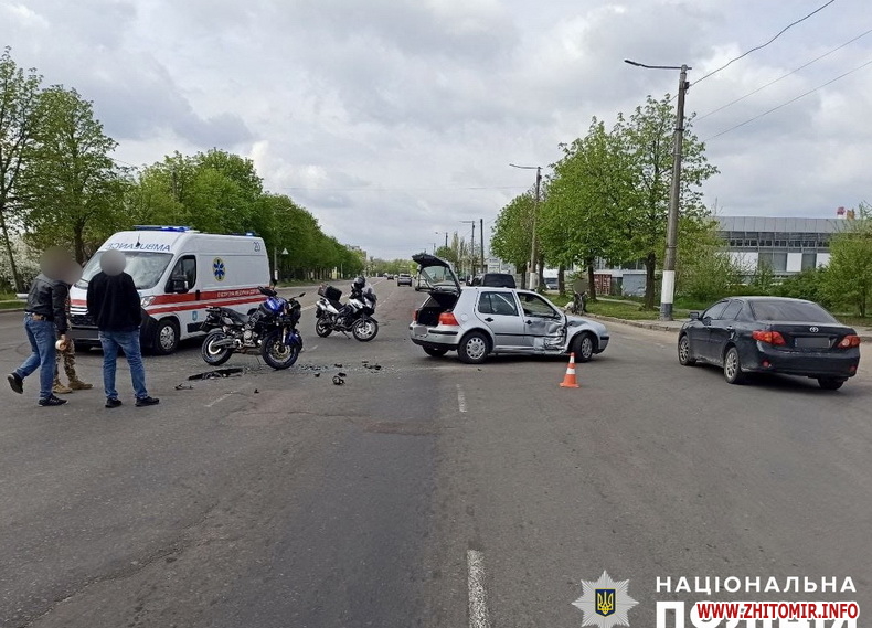 «Автотроща сталася 13 квітня по проспекту Незалежності. Попередньо, близько 10:30 відбулося зіткнення автомобіля «Volkswagen» під керуванням 38-річного жителя Житомирського району та мотоцикла «Yamaha». У результаті ДТП керманич двоколісника, 45-річний житомирянин, отримав тілесні ушкодження та був доставлений до медичного закладу», - йдеться у повідомленні.