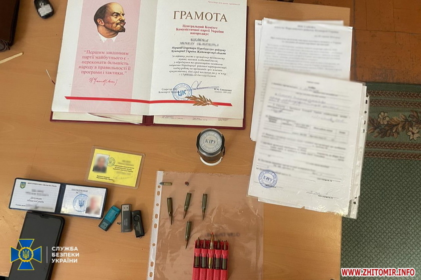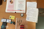 Під час санкціонованих обшуків за місцем служби і роботи фігуранта вилучено: його чорнові записи та інші документальні докази протиправної діяльності; тротил і бойові набої, які зберігалися незаконно; заборонену комуністичну символіку.