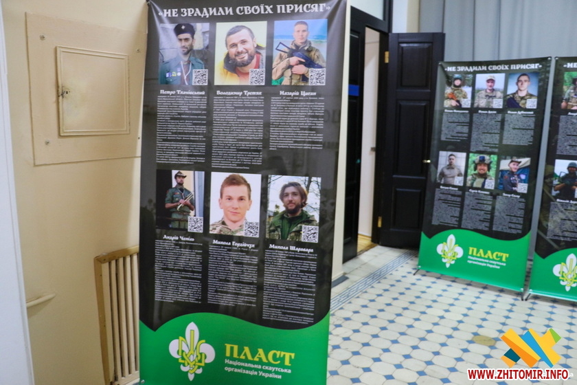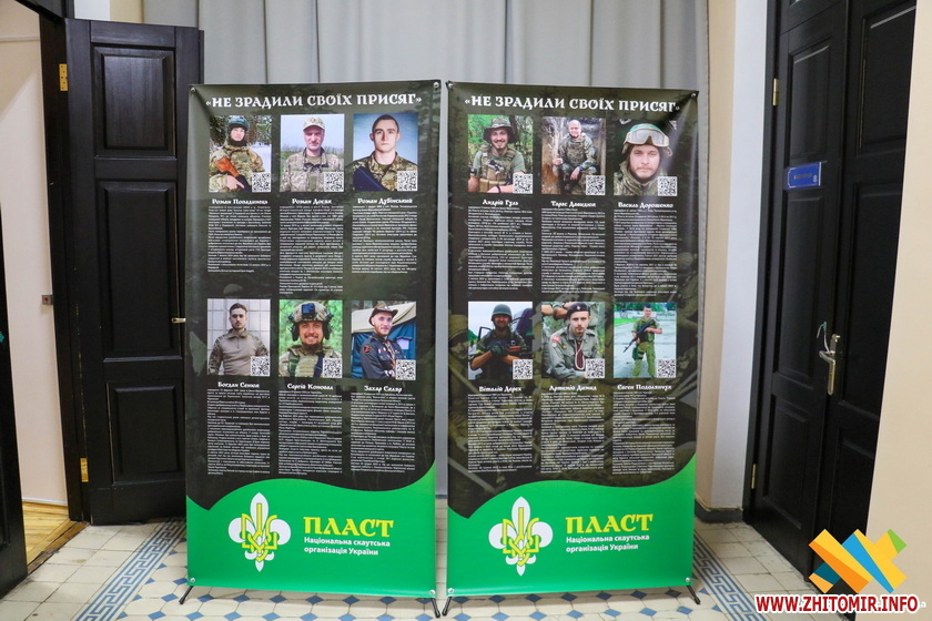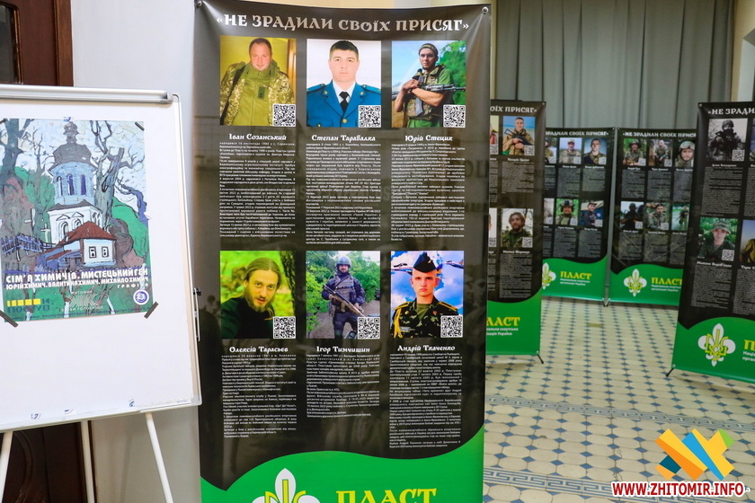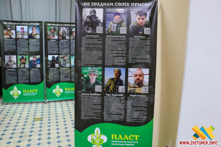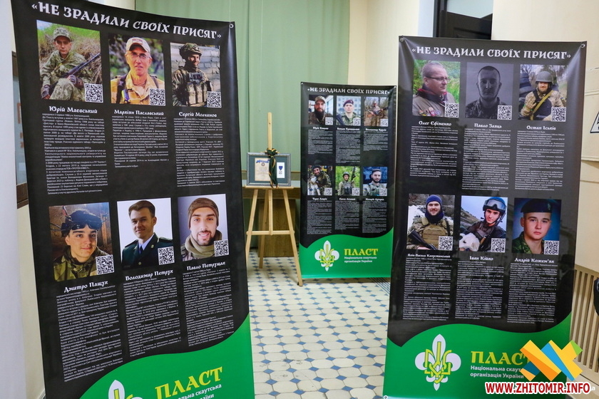 «Більшість пластунів, які представлені на виставці, загинули після 2022-го. Їх більш, ніж 50. Про деяких будемо сьогодні переглядати фільми. Всі вони колись були нашими вихованцями, ходили в походи, але змушені були стати на захист нашої Батьківщини. Наразі близько 500 пластунів і досі служать», – говорить в. о. директора Пластовий молодіжний центр Житомирської міської ради Павло Кобзар.