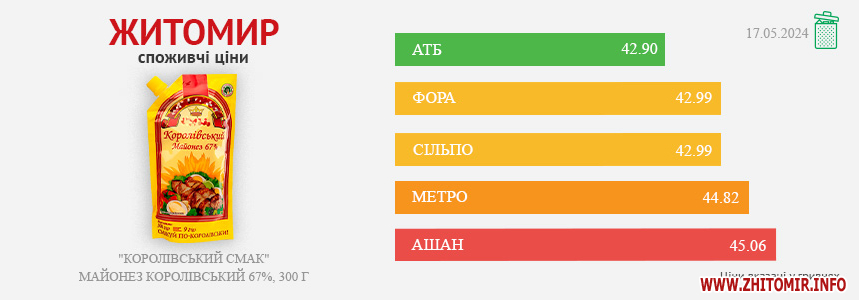 Моніторинг здійснено на основі інформації, отриманої за методом контрольної закупки 17.05.2024 р. у місцях продажу: АТБ, пр. Миру, 15 А, Фора, вул. Лятошинського, 2, Метро, вул. Ватутіна, 55-в, Сільпо, вул. Житній ринок, 1, Ашан, вул. Київська, 77