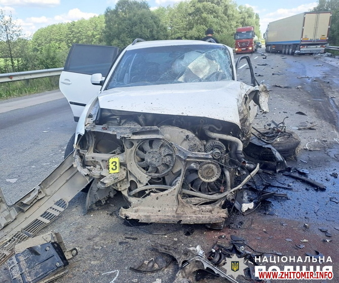 «Попередньо встановлено, що під час руху в автомобілі «Volkswagen Passat», за кермом якого перебував 32-річний житель м. Малина, лопнуло заднє колесо. Через це відбувся занос транспортного засобу та його зіткнення з кросовером «Mitsubishi Outlander» під керуванням 64-річного жителя Дніпропетровщини, що рухався у попутному напрямку. Внаслідок удару обидва автомобілі потрапили на зустрічну смугу руху та відбулося їх зіткнення з вантажівкою «Mercedes-Benz Actros», якою керував 49-річний житель Одещини», - йдеться в повідомленні.