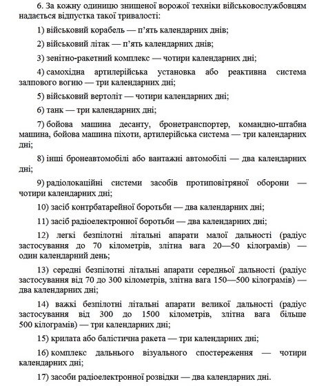 Нижче – кількість днів відпустки за одиницю знищеної ворожої техніки: