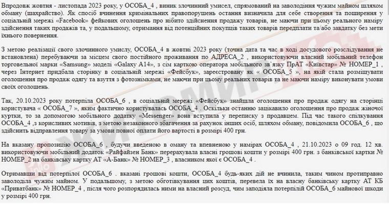 «Впродовж жовтня — листопада 2023 року, у ОСОБА_4 , виник злочинний умисел, спрямований на заволодіння чужим майном шляхом обману (шахрайство). Як спосіб вчинення кримінальних правопорушень остання визначила для себе створення та поширення у соціальній мережі «Facebook» фейкових оголошень про нібито здійснення продажу товарів, не маючи при цьому реального наміру здійснення таких продажів та, у подальшому, отримання від потенційних покупців таких товарів передплати та/або завдатку без мети їхнього повернення», - йдеться у вироці суду.