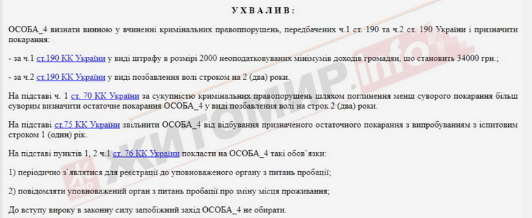 Жінку визнали винною у шахрайстві та присудили 34 тис. грн штрафу й 2 роки позбавлення волі, однак суд замінив позбавлення волі 1 роком іспитового строку.