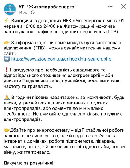 «Виходячи із доведених НЕК «Укренерго» лімітів, 01 червня з 18:00 до 24:00 на Житомирщині можливе застосування графіків погодинних відключень (ГПВ). З інформацію, коли саме можуть бути застосовані відключення (ГПВ), можна ознайомитись на нашому сайті: