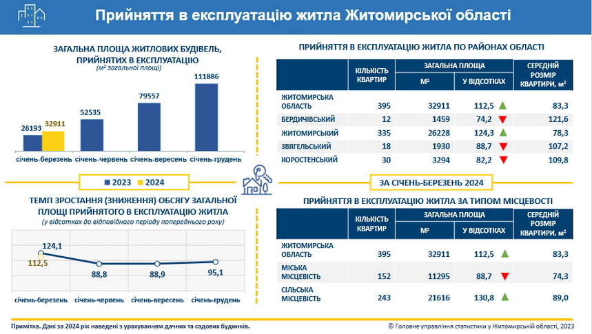 У будинках здано в експлуатацію 395 квартир. Середня загальна площа однієї новозбудованої квартири становила 83,3 кв.м (у січні-березні 2023 року – 113,4 кв.м).