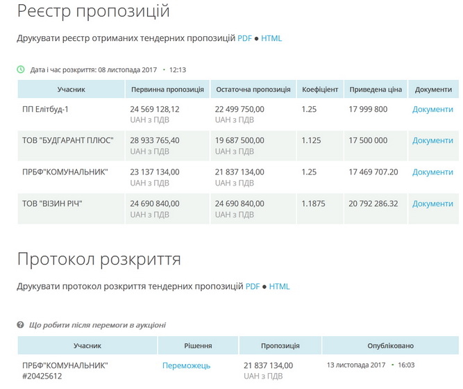 Нагадаємо, тендер на реконструкції житомирського стадіону «Спартак», який УКБ проводило в листопаді 2018 року, мав початкову ціну 30 млн грн, учасників було четверо, переможцем стало житомирське ПРБФ «Комунальник» з пропозицією 21,8 млн грн.