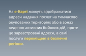 Звертаємо увагу, що на е-Карті можуть бути відображені адреси надання послуг на тимчасово окупованих територіях або в зонах ведення активних бойових дій, проте це зареєстровані адреси, а самі послуги переміщені в безпечні регіони.
