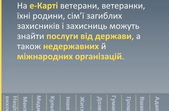 «Мінветеранів запускає ще одне цифрове рішення задля розширення та спрощення доступу до інформації про всі наявні в Україні послуги від усіх стейкхолдерів. E-Карта — це по суті агрегатор даних, якого бракувало ветеранській спільноті. Тепер усе, що потрібно ветеранам і ветеранкам, можна швидко знайти через свій смартфон або комп’ютер, зазначивши лише область або свою територіальну громаду. Е-Карта — це, в першу чергу, інструмент інформування про можливості розвитку й допомоги для ветеранів і ветеранок у їхніх громадах. У той же час, це єдине місце, де інформація подана простою мовою про те, що можна отримати просто тут і зараз», — говорить в.о. Міністра у справах ветеранів України Олександр Порхун.