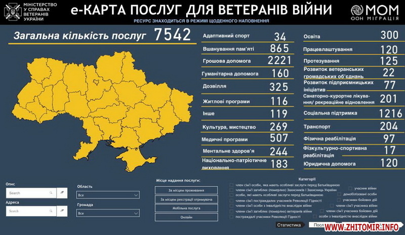«Міністерство у справах ветеранів України спільно з Представництвом Міжнародної організації з Міграції в Україні розробило та запустило е-Карту послуг для ветеранів війни в громадах. Е-Карта доступна на платформі е-Ветеран. На е-Карті ветерани та ветеранки, їхні родини, сім’ї загиблих захисників і захисниць можуть знайти послуги, що пропонує для них державою, а також недержавні й міжнародні організації», - йдеться у повідомленні.