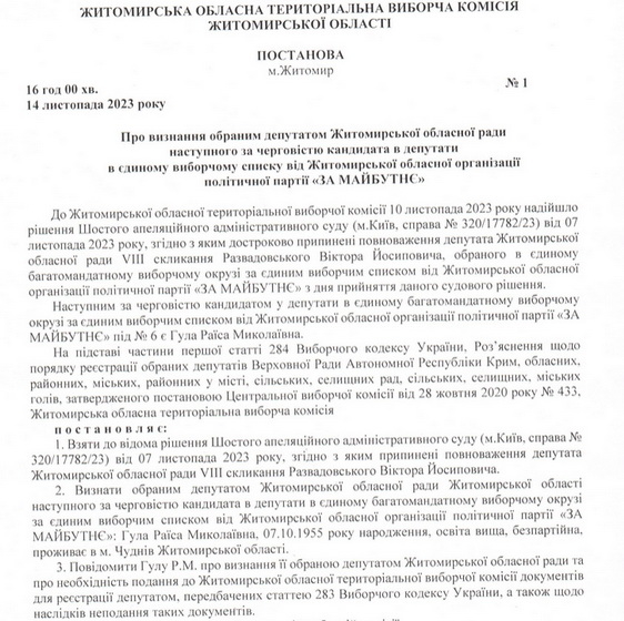 Зауважимо, що рішення про те, що Раїса Гула, яка була №6 у партійному списку «За майбутнє», визнана обраним депутатом Житомирської обласної ради обласна територіальна виборча комісія ухвалила ще 14 листопада 2023 року. Цим ще рішенням обласна ТВК взяла до відома рішення суду щодо припинення депутатських повноважень Віктора Развадовського.