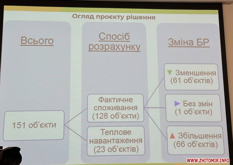 «Розрахунок базових рівнів ми проводимо щороку. Використовуємо дані споживання за три роки. В цьому році йде тенденція до збільшення споживання, але цьому є обґрунтовані причини. Всього було обраховано базових рівнів для 151 об’єкта (бюджетні установи Житомирської громади), з них для 128 - на основі фактичного споживання теплової енергії, а для 23 – на базі рівнів розрахунків з урахуванням теплового навантаження, там відсутні теплові лічильники. Як я й казала, зафіксоване збільшення базових рівнів приблизно для половини об’єктів: для 66 об’єктів зафіксоване збільшення, для 61 – зменшення, по 1 об’єкту базовий рівень залишився на тому ж рівні. Загальне збільшення базових рівнів по всім об’єктам складає близько 247 ккал. В грошовому еквіваленті це приблизно 880 тисяч гривень. Відбулося це у зв’язку із тим, що наші школи і дитячі садки влаштовували найпростіші укриття, додавали до них площу, радіатори, і тому, відповідно, споживання було збільшено. Є позитив по нашій лікарні №1: по двох корпусах відбулося значне зменшення, приблизна сума економії становить 640 тисяч гривень», - сказала Вікторія Сичова.