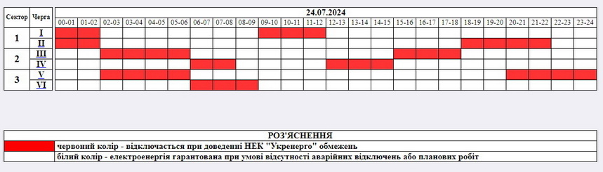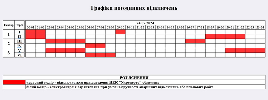 Отримано розпорядження диспетчера НЕК «Укренерго» на сьогодні, 24 липня 2024 року, відмінити застосування графіків погодинних відключень до 16:00.