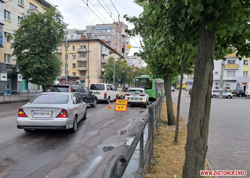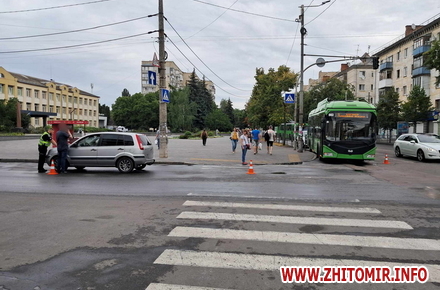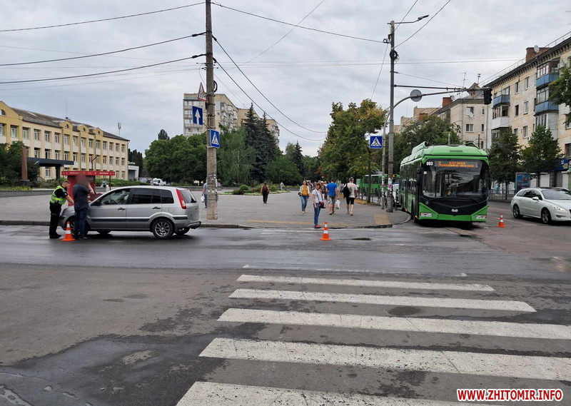 Вранці 26 липня у Житомирі на перехресті вулиць Київська та Хлібна не розминулися тролейбус й легковий автомобіль. На дорозі виник невеликий затор.