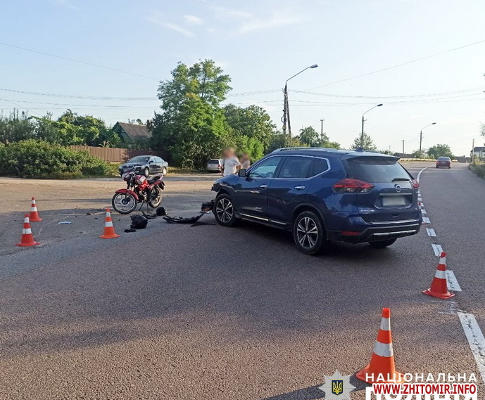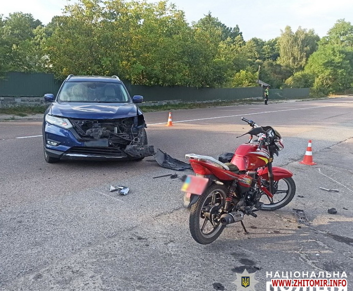«Дорожньо-транспортна пригода сталася 28 липня на 12 км автодороги Житомир-Чернівці, у селі Перлявка. Попередньо, близько 17:25 відбулося зіткнення автомобіля «Nissan» під керуванням 52-річного житомирянина та мопеда «Mustang». У результаті ДТП керманич двоколісника, 15-річний місцевий житель, отримав травми та був доставлений до медичного закладу», - йдеться у повідомленні.