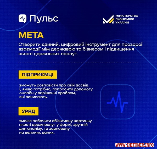 «Пульс - онлайн платформа для збору відгуку від бізнесу про взаємодію з державою. Мета платформи - створити єдиний цифровий інструмент для прозорих відносин між державою та бізнесом для підвищення якості державних послуг. Тепер кожен підприємець може поставити оцінку послугам, які надає держава», - йдеться у повідомленні.