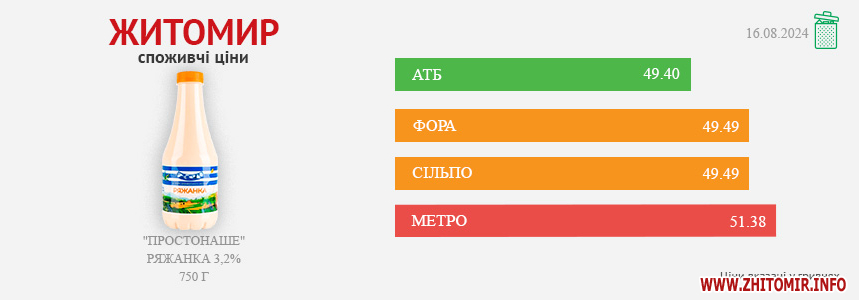 Моніторинг здійснено на основі інформації, отриманої за методом контрольної закупки 16.08.2024 р. у місцях продажу: АТБ, пр. Миру, 15 А, Фора, вул. Лятошинського, 2, Метро, вул. Ватутіна, 55-в, Сільпо, вул. Житній ринок, 1