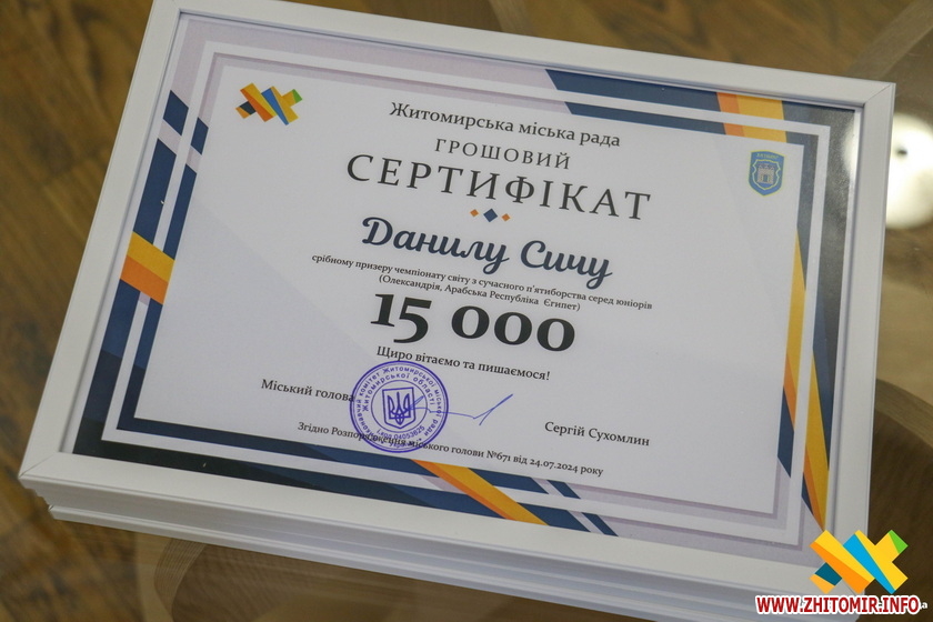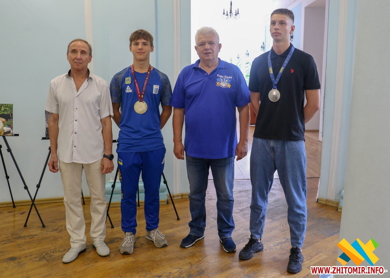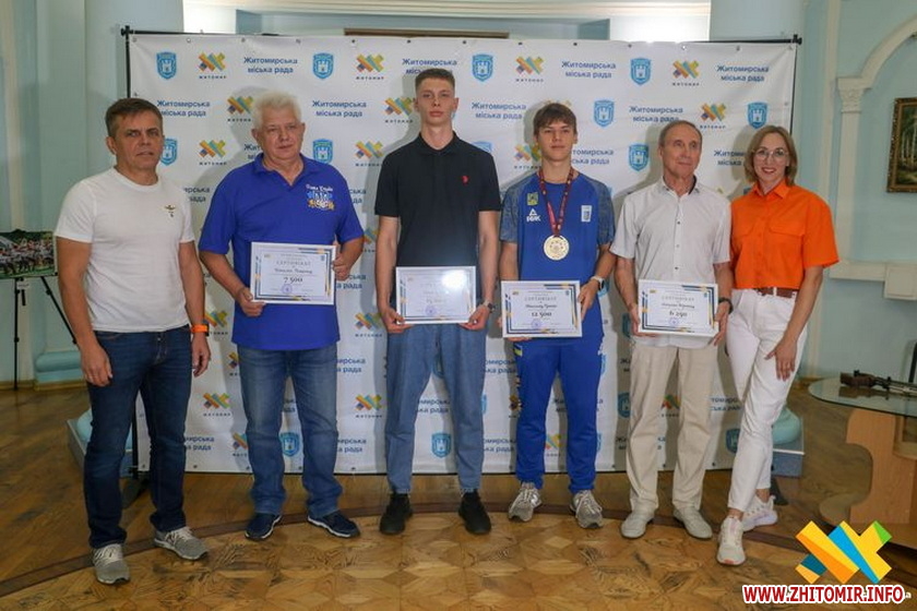 Двом житомирським спортсменам Максиму Гриню та Данилу Сичу і їхнім тренерам Олексію Юрчаку та Віталію Тищенку у міській раді вручили грошові сертифікати.