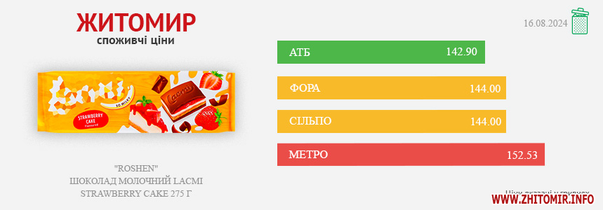 Моніторинг здійснено на основі інформації, отриманої за методом контрольної закупки 16.08.2024 р. у місцях продажу: АТБ, пр. Миру, 15 А, Фора, вул. Лятошинського, 2, Метро, вул. Ватутіна, 55-в, Сільпо, вул. Житній ринок, 1