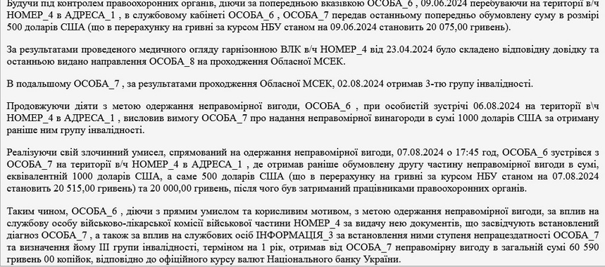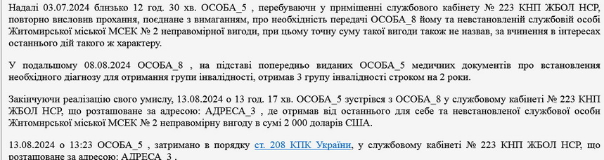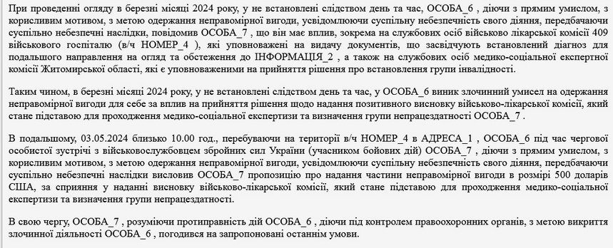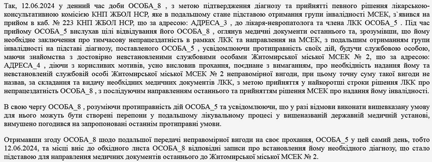Як повідомляв Житомир.info, 19 березня 2024 року у Житомирі викрили лікаря медцентру на Корбутівці та його спільника, які вимагали у військовозобов’язаного гроші за «правильний» висновок лікарської комісії: наприкінці лютого лікар отримав свій перший «гонорар» у розмірі 5 тисяч гривень, а потім залучив посередника, який висловив вимогу пацієнту надати ще 1,5 тис. доларів. Наприкінці липня завершили розслідування та скерували до суду справу 29-річного завідувача відділення житомирського обласного центру реабілітації та його 42-річного спільника, який раніше притягувався до кримінальної відповідальності за крадіжку.