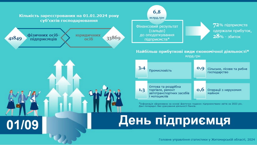 За інформацією обласного управління статистики, на початок 2024 року в Житомирській області було зареєстровано 33,9 тисячі підприємств та 41,8 тисячі фізичних осіб-підприємців.
