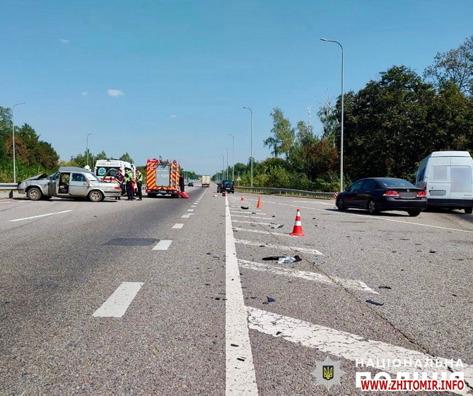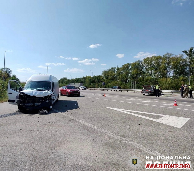 «Автотроща сталася 30 серпня на 84 км автодороги Київ – Чоп, неподалік с. Кочерева. На місці події працювала слідчо-оперативна група відділення поліції №3 (м. Радомишль) Житомирського райуправління. Попередньо, близько 13:30 автомобіль «ГАЗ», під керуванням 82-річного киянина, зіткнувся з мікроавтобусом «Renault Master», за кермом якого перебував 35-річний італієць. На жаль, від травм, отриманих унаслідок ДТП, пасажирка легковика, 83-річна жителька м. Києва, загинула на місці події. Водія автомобіля «ГАЗ» із тілесними ушкодженнями доставлено до медичного закладу», - йдеться у повідомленні.