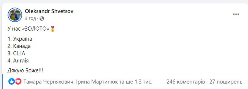 «У нас «золото»! 1. Україна, 2. Канада, 3. США, 4. Англія. Дякую Боже», - написав Олександр Швецов на своїй сторінці у facebook.